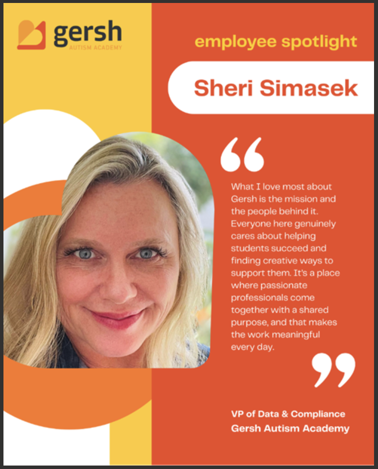 Sheri Simasek is the VP of Data & Compliance, where she oversees regulatory compliance, operational alignment, and data systems that support student services across the organization. Sheri started with Gersh in November of 2023 and quickly dove into building efficient processes, aligning teams around clear systems, and ensuring schools meet complex state and federal requirements. She is known for translating complicated regulations into practical, workable systems that support both staff and students.